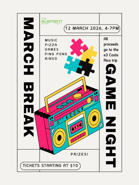 The e3s are proud to announce the second official Element party! On the Thursday before March Break, March 12th, from 4:00 – 7:00pm, hang out and play ping pong, board games, and for the first time, a bingo night! Get tickets for $12 at the door, or $10 online. Pizza will be available through online purchase and in person, along with snacks and drinks. Come by to kick off march break with a fun night!